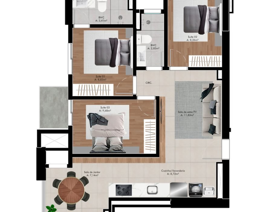 Suíte + 01 com 71,82 m²